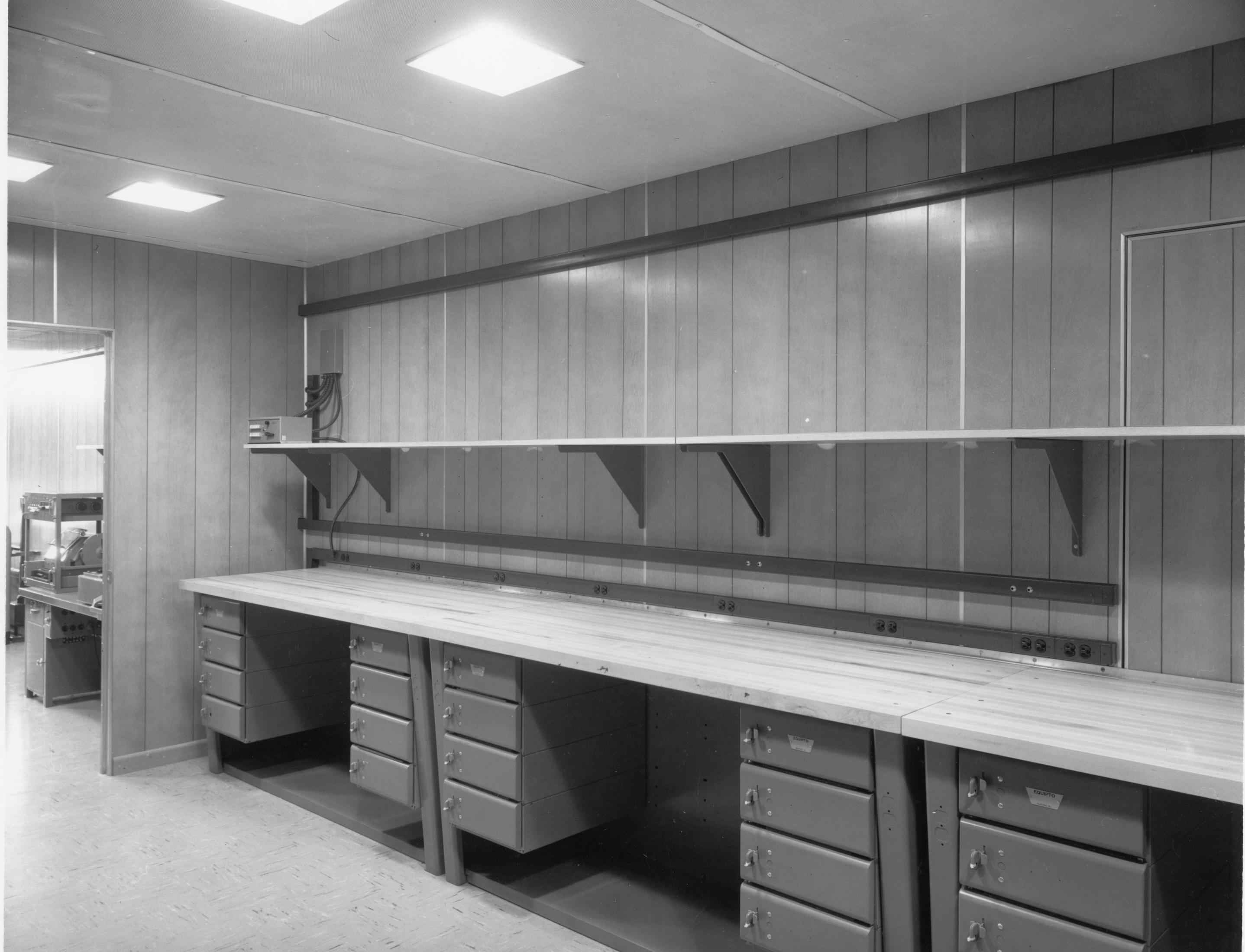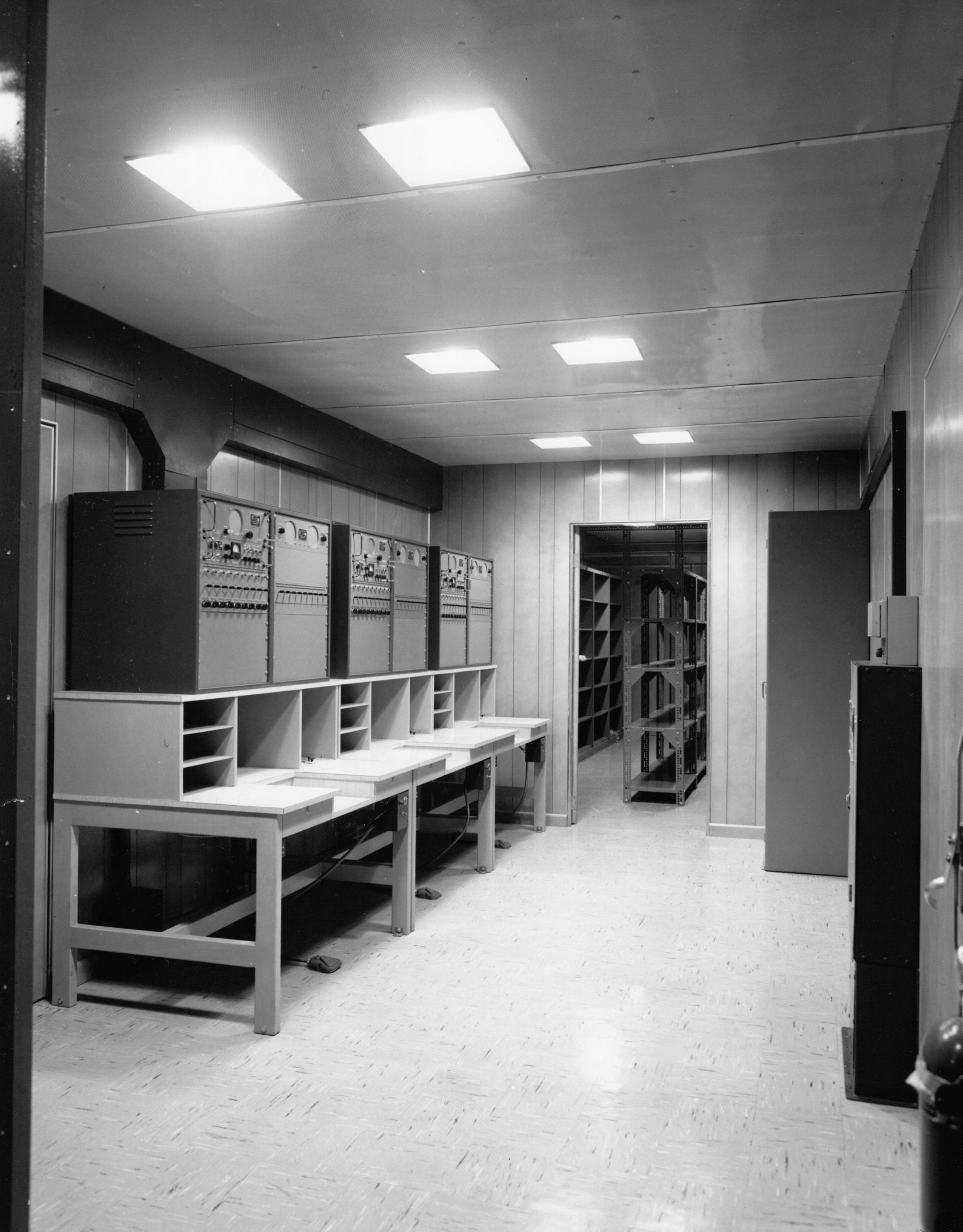 workbenches, tools, parts storage racks, TTY test equipment, a BLACK INTERCOM