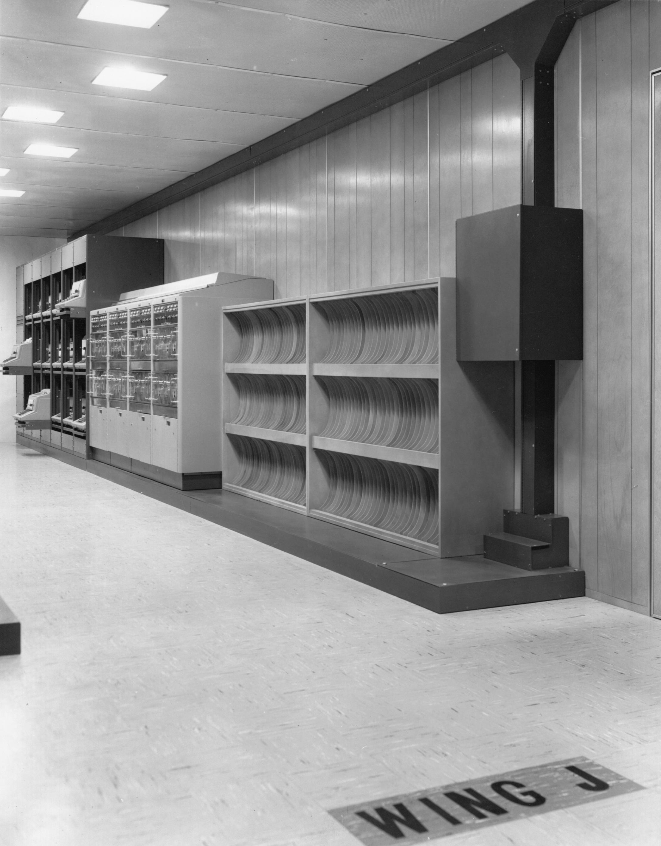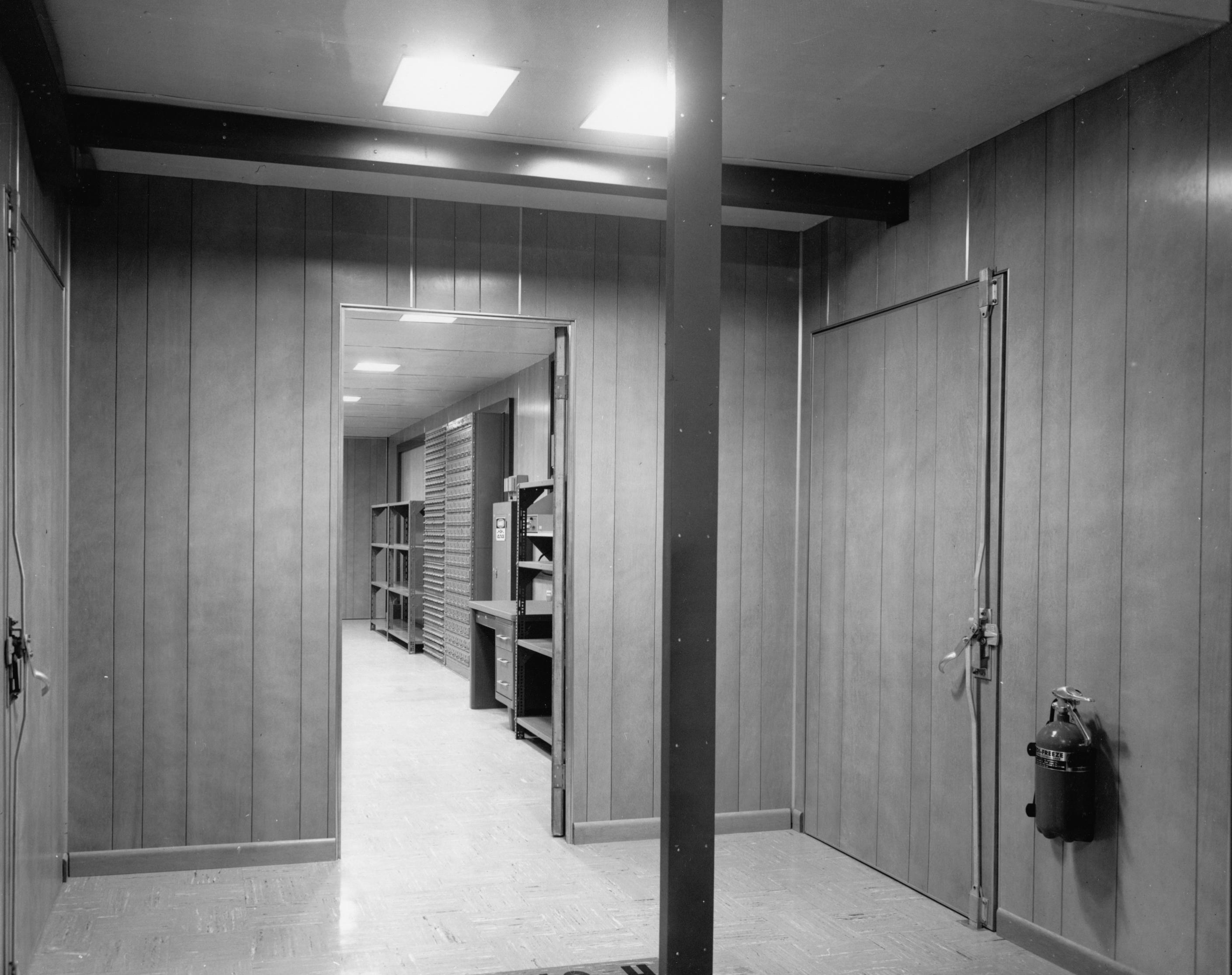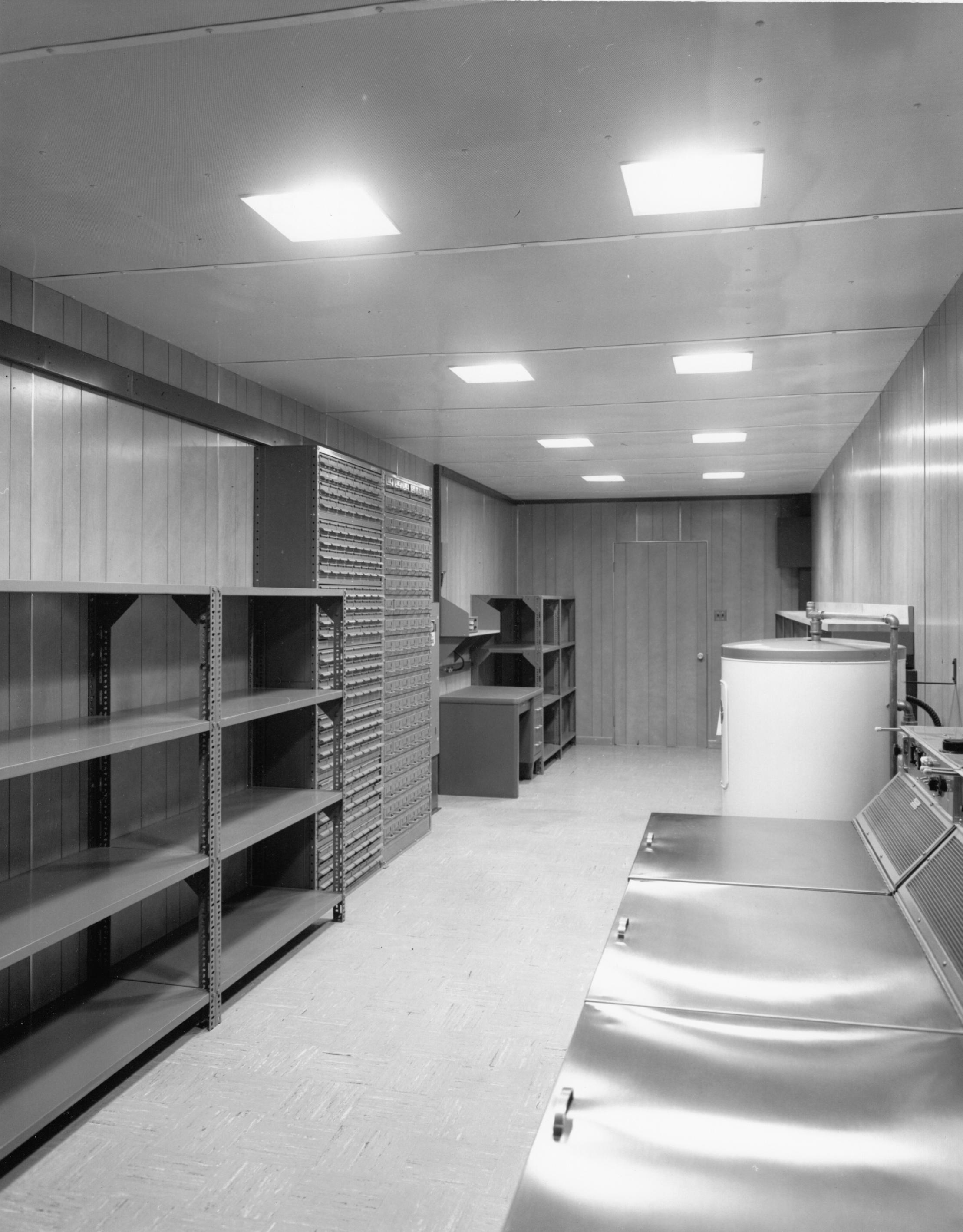 cabinet and a pigeon-hole tape-storage cabinet. A BLACK INTERCOM unit is