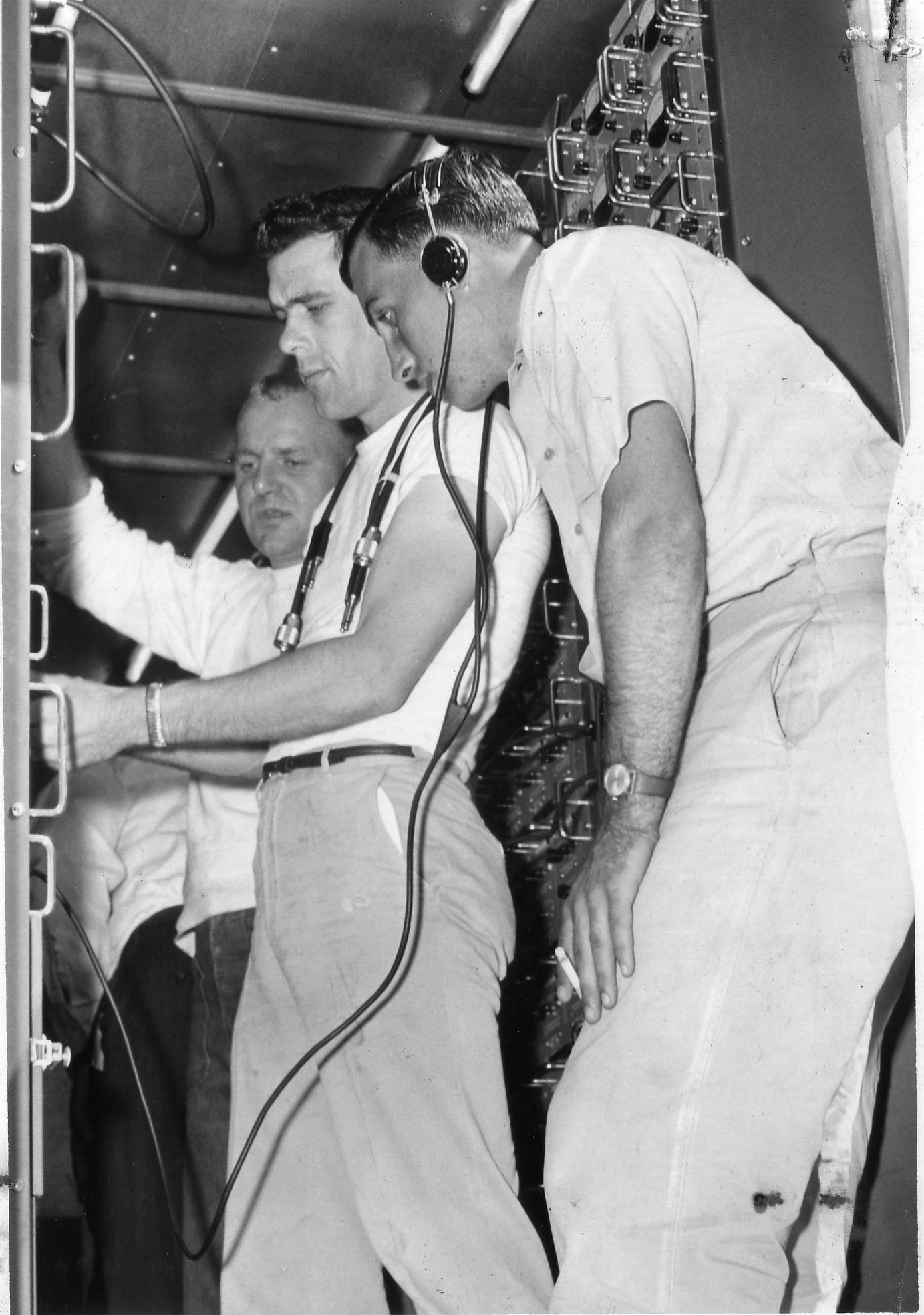 RMC Robert LePage, RM1 Elvin Shively, LTJG Robert Kolker - ATCU Receiver-Control Shelter - AN/FGC-60 in background |