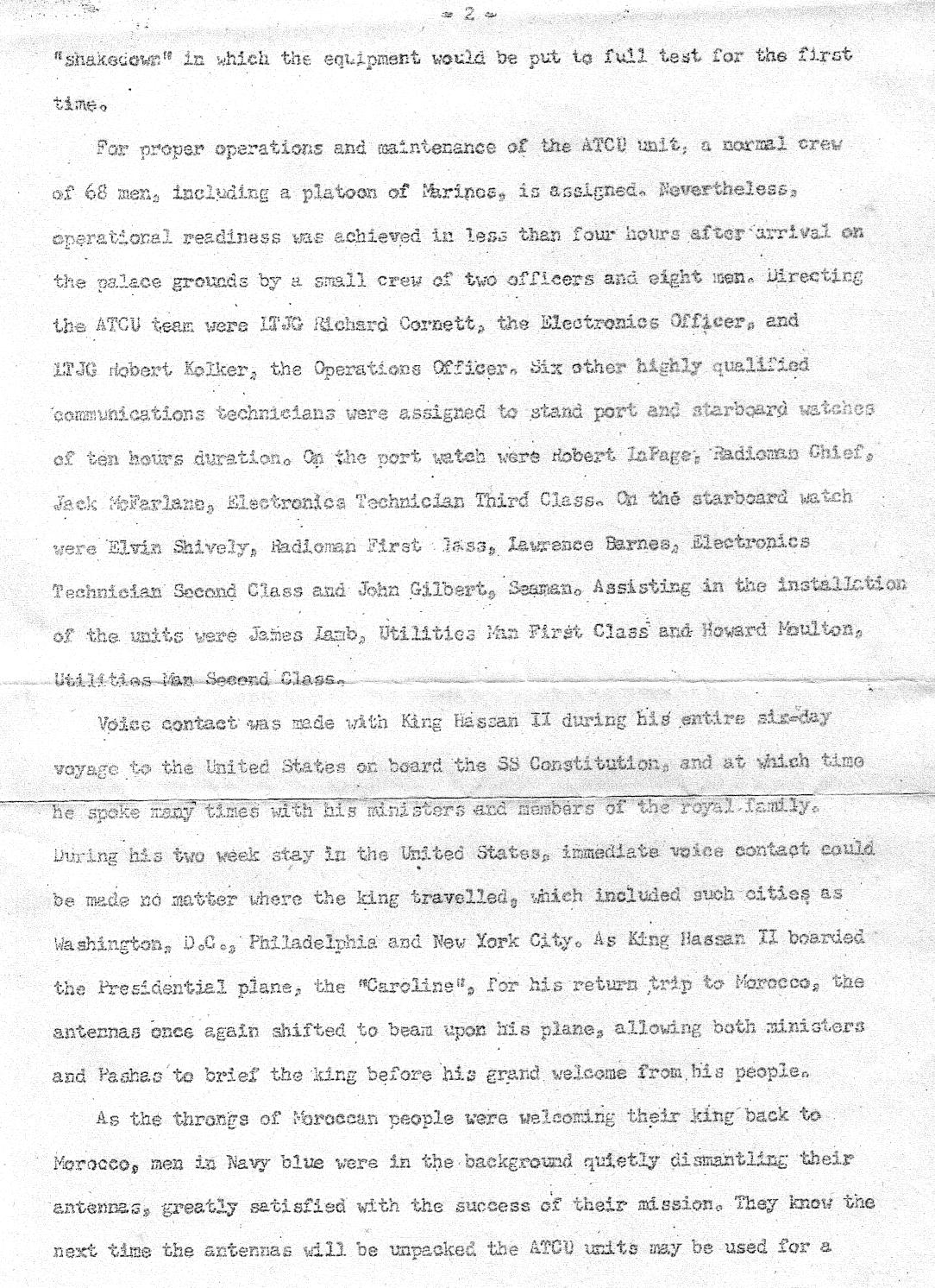 During King Hassan II's official visit to the United States in March-April 1963, the US Naval Communications Station Sidi Yahia deployed an ATCU-100 transportable communications unit to the palace grounds in Rabat, Morocco. The ATCU (call sign Road Runner) provided communications between the King and his government during the King's travels to and from the US as well as throughout the US during his visit. See press release below for more details.