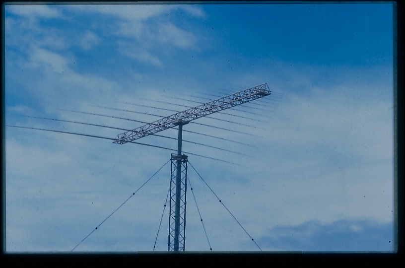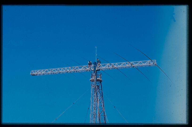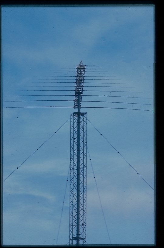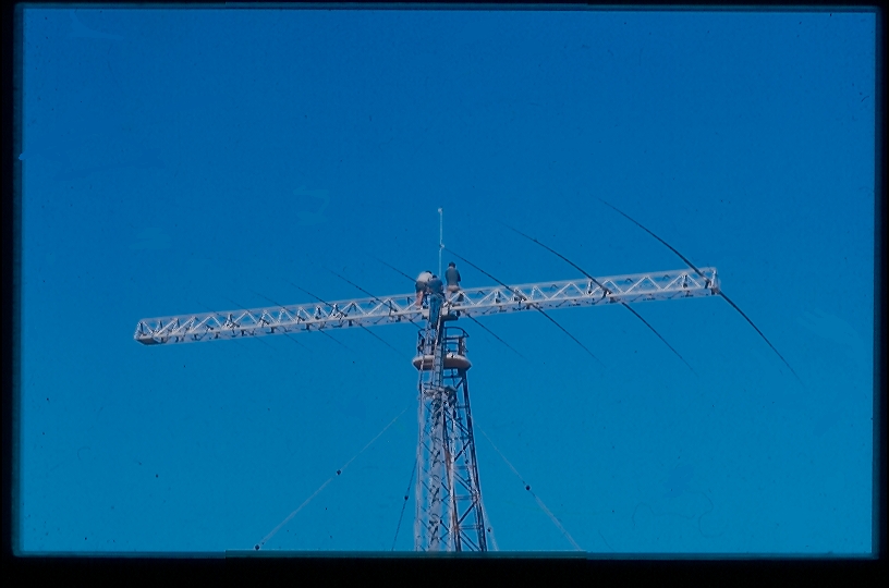 Area "A", located at the extreme northern tip of the cape was known as the "Low Frequency Area." This area, 5,600 acres in size, contained the VLF transmitter facility consisting of the antenna and transmitter building. The antenna system dominated the area. It was composed of a complex of towers and antenna wire systems, resembling a six pointed star, approximately 8,400 feet in diameter. The elevated wires were supported at an average height of 900 feet by twelve towers arranged in a hexagonal pattern in two rows around a central thirteenth tower. This central tower was 1,296 feet high while the towers of the inner ring were 1,195 feet high and those of the outer ring were 996 feet high. At the time of its construction the central tower was the tallest structure in the southern hemisphere. Although the shortest, the outer ring towers were still taller than the Eiffel Tower. These outermost towers of the complex were 1.56 miles apart. More than six miles of steel guy wires, nearly two inches in diameter, safeguarded the aerial maze against hurricane-force winds.