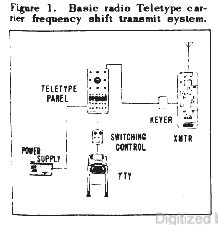Figure 1 shows the basic components used for transmission of the carrier frequency shift system. These components are: Power supply, Teletype panel, switching control, and teleprinter, as well as the Keyer and transmitter.