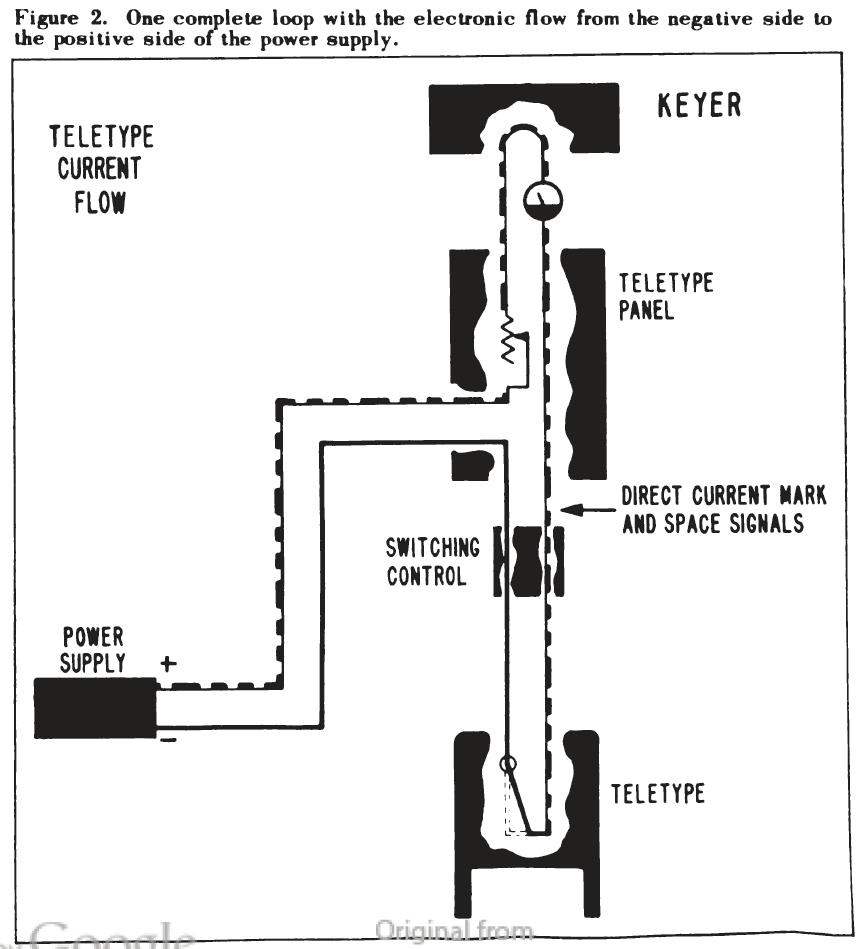 The teleprinter may be visualized as a switch that opens and closes the looping circuit. This feature causes on-and-off pulses of the direct current. These pulses are known as "marks" and "spaces."