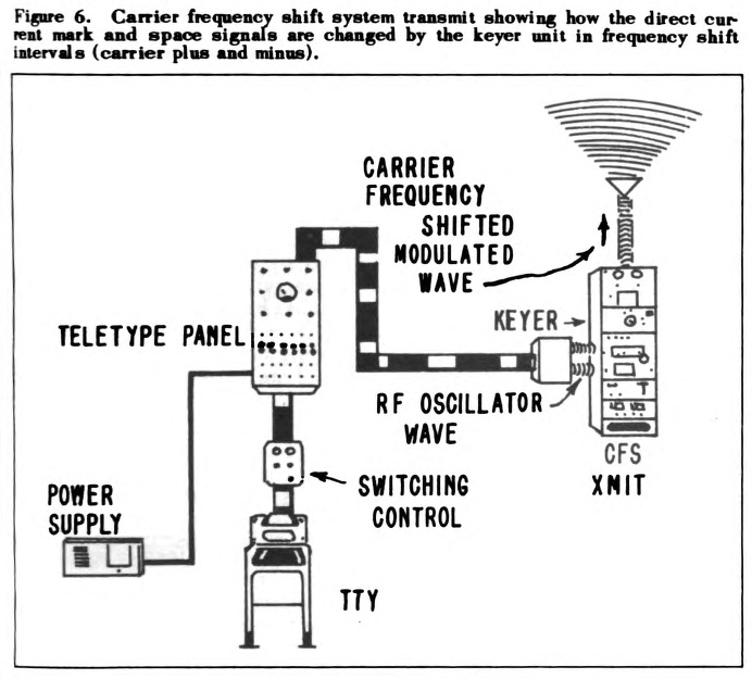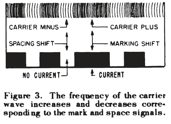 The carrier frequency itself never reaches the antenna because the keyer receives the carrier frequency from the transmitter and the direct current on-and-off pulses from the teleprinter. These pulses automatically shift the basic frequency to "plus" for marks and "minus" for spaces. Then the frequency shifted carrier wave goes back to the transmitter.