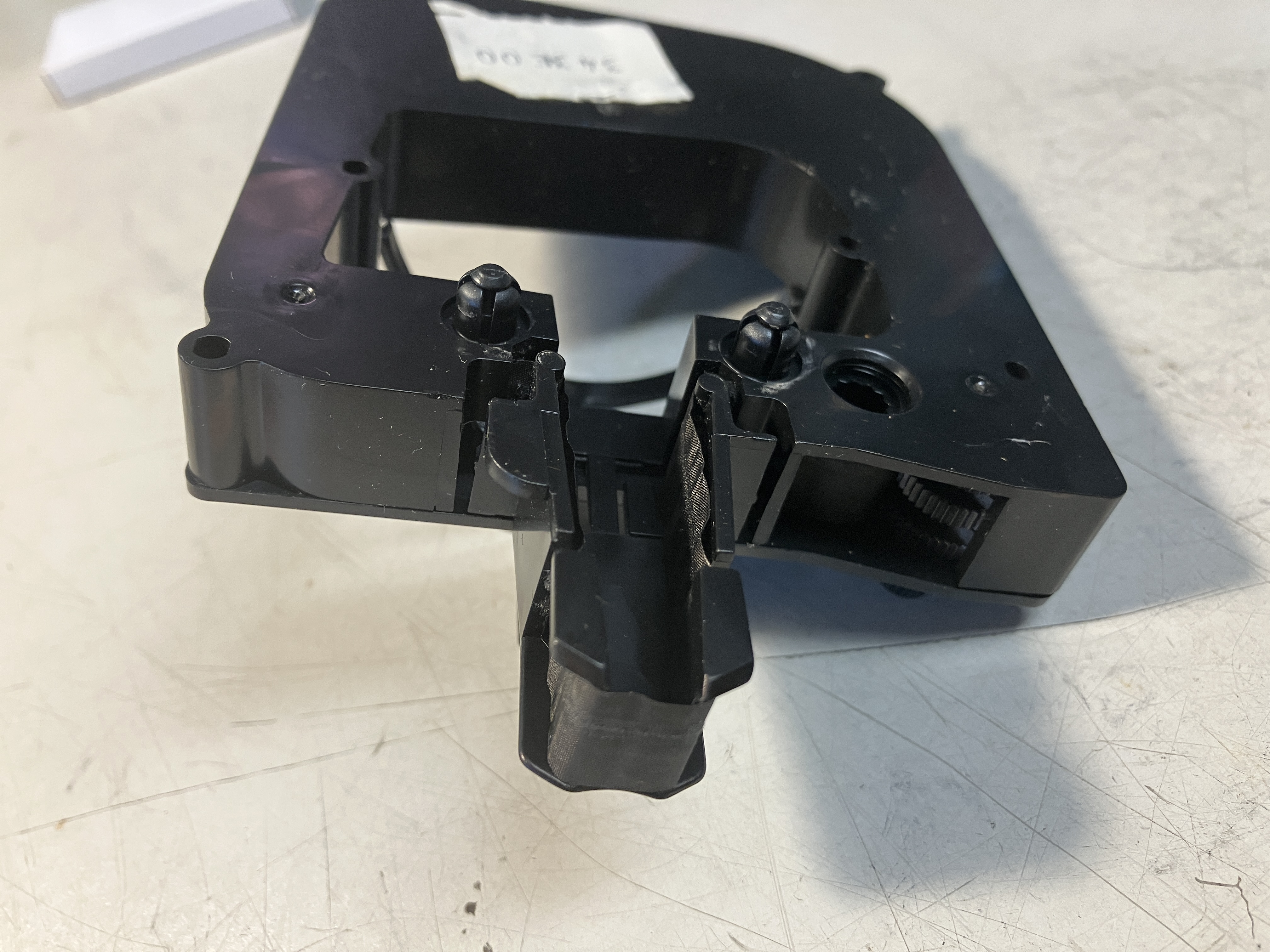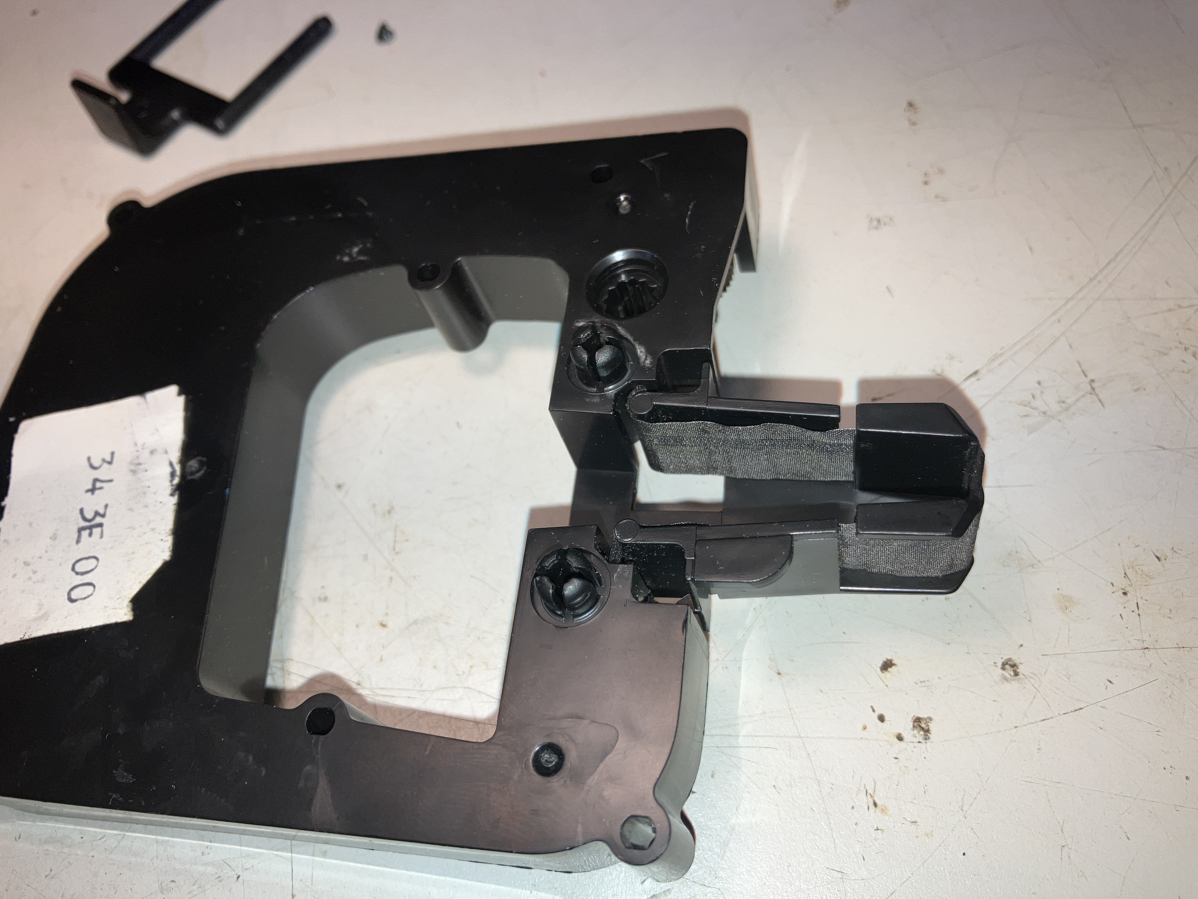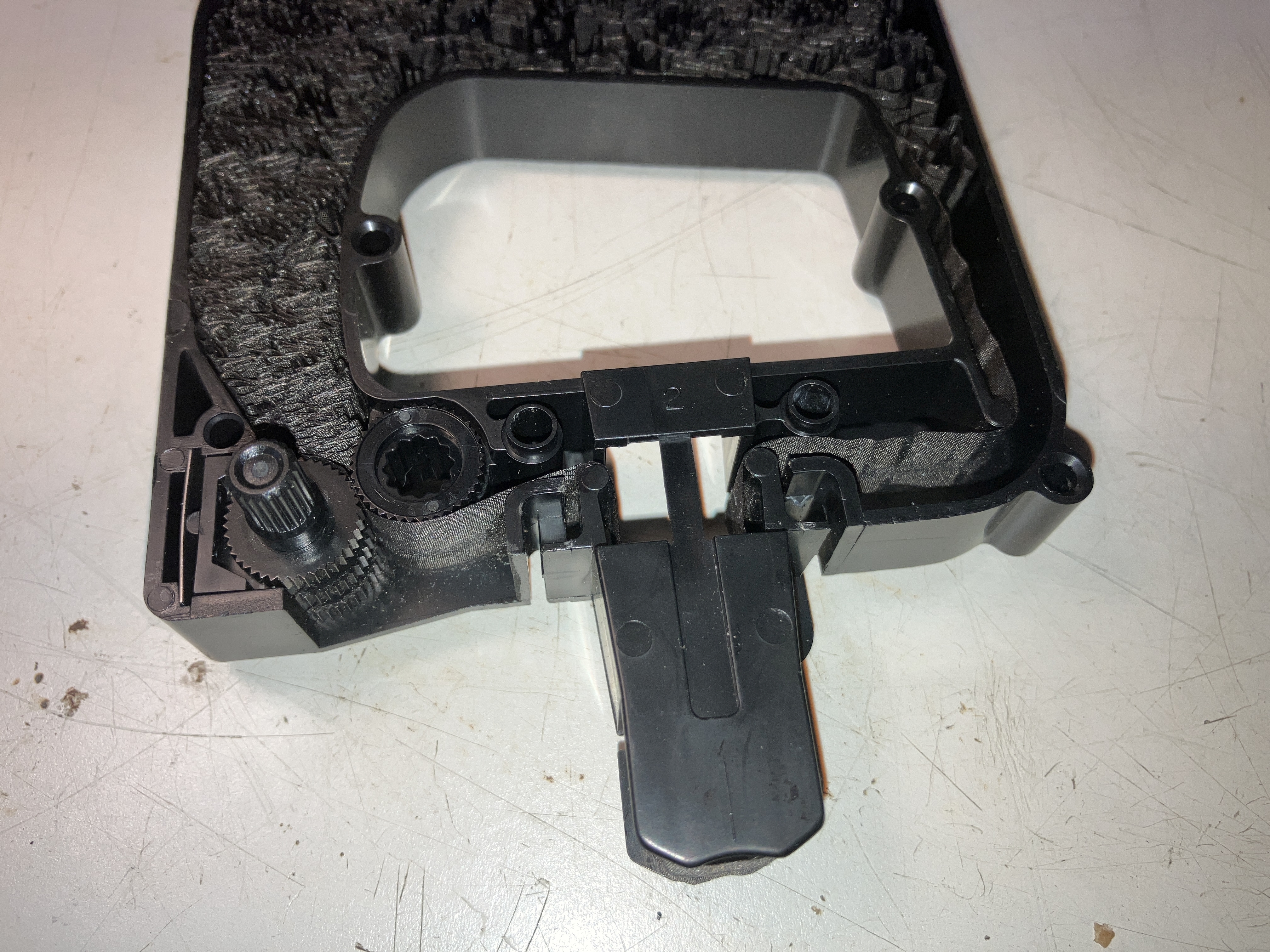 Close up of drive gear and manual gear - note that there is a flat piece of spring steel that applies tension to the sliding bracket that cradles the manual gear
