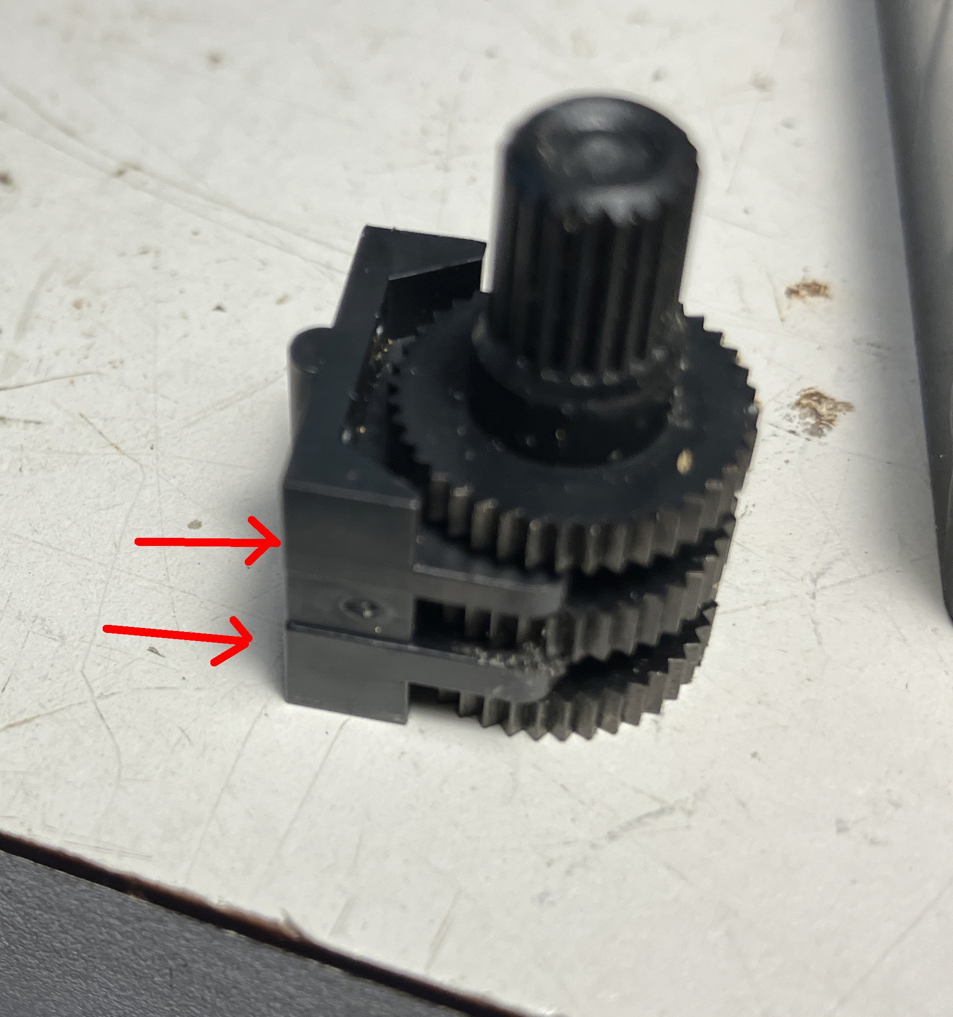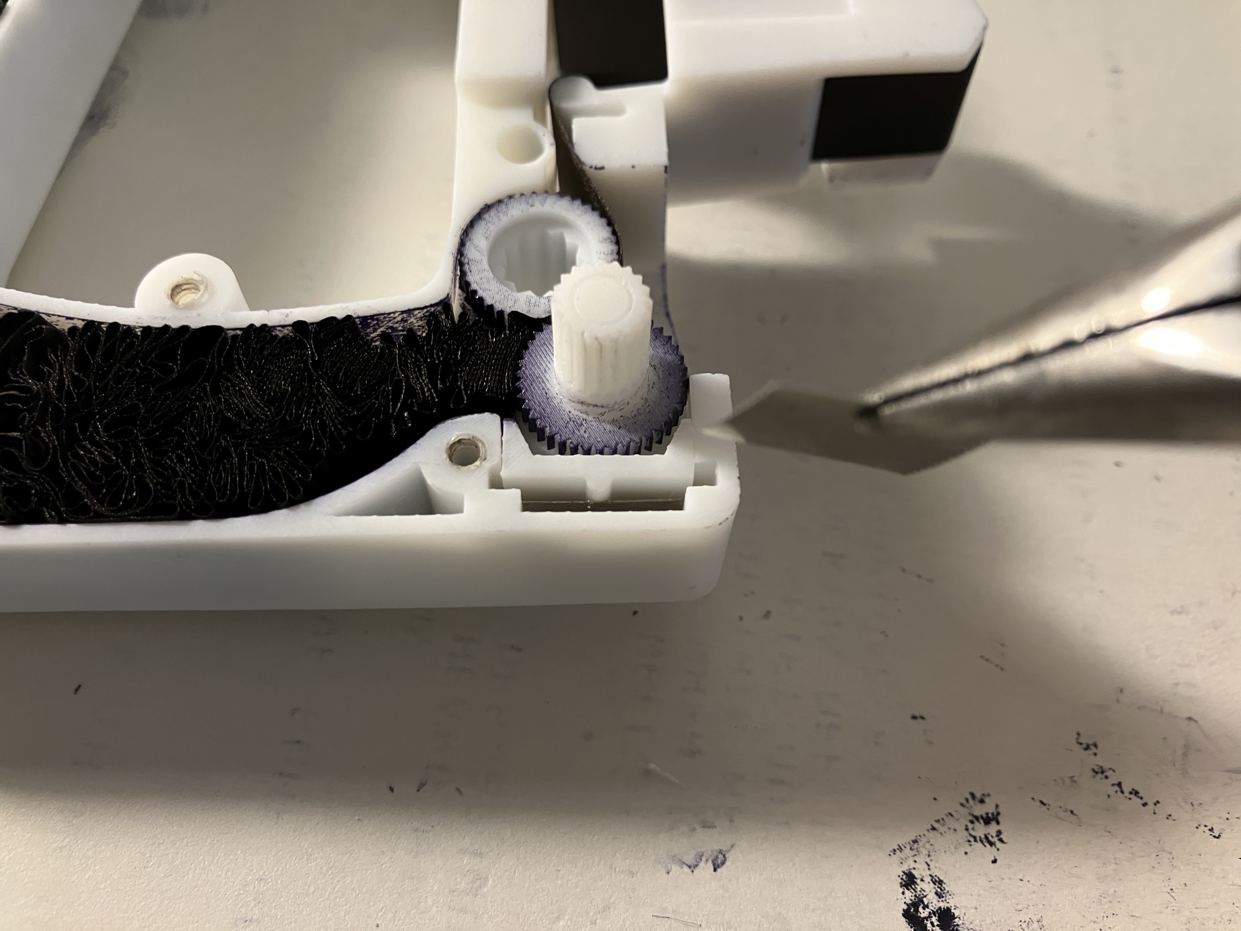 PROBLEM #1 -  I let the ribbon wrap around the drive gear - symptom was that turning the knob went from easy to almost impossible.
