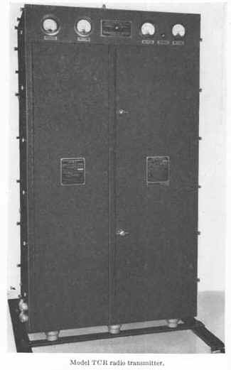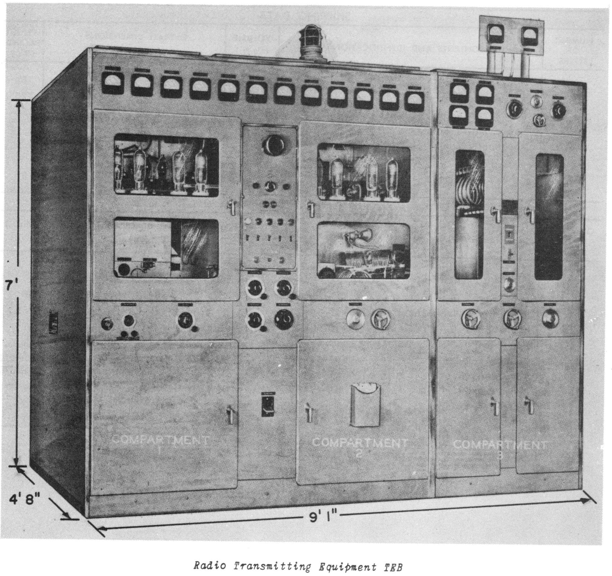 Radio Transmitting Equipment TEB is used for general purpose, high-power, h-f, radiotelegraph, or frequency-shift operation in shore-to-ship, and point-to-point communication. Vacuum-tube keying speeds up to 400 wpm are possible, and provision is made for the connection of an external frequency shift keyer.